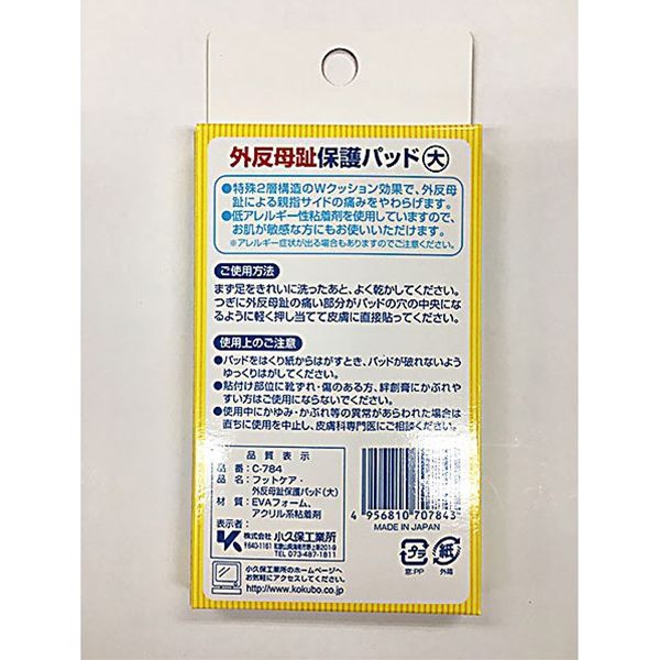 □1枚のサイズ(約)・45×30×3mm□色・肌色□材質・EVAフォーム、アクリル系粘着剤□用途・衛生 外反母趾パット 足の保護□キーワード・ほごぱっど がいはんぼし ほご あしゆび あし ふっとけあ□シリーズ名・フットケア□品名・フットケア 外反母趾 保護パッド 大 4P□品番・C-784□JAN・4956810707843□メーカー名・(株)小久保工業所□カテゴリ・E210002□管理単位・6個/240個□入数・4枚