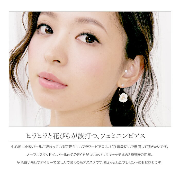 中心部に小粒パールが収まっている可愛らしいフラワーピアスは、ぜひ普段使いで着用して頂きたいです。